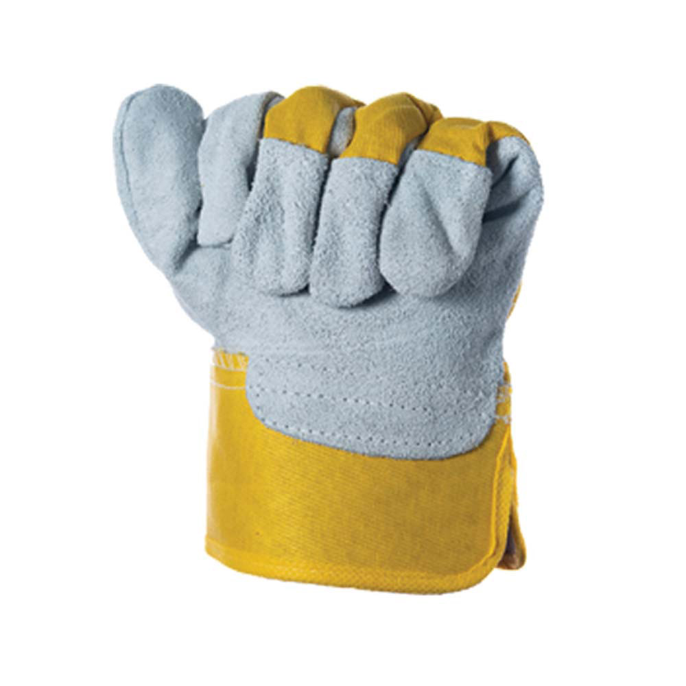 Γάντια εργασίας τύπου Jean. Το μπροστινό μέρος του γαντιού και τα δάκτυλα είναι από δέρμα σχιστού μόσχου και το πίσω μέρος από βαμβακερό ύφασμα με ελαστική ταινία σύσφιξης. Φοδραρισμένο με σκληρή υφασμάτινη μανσέτα.