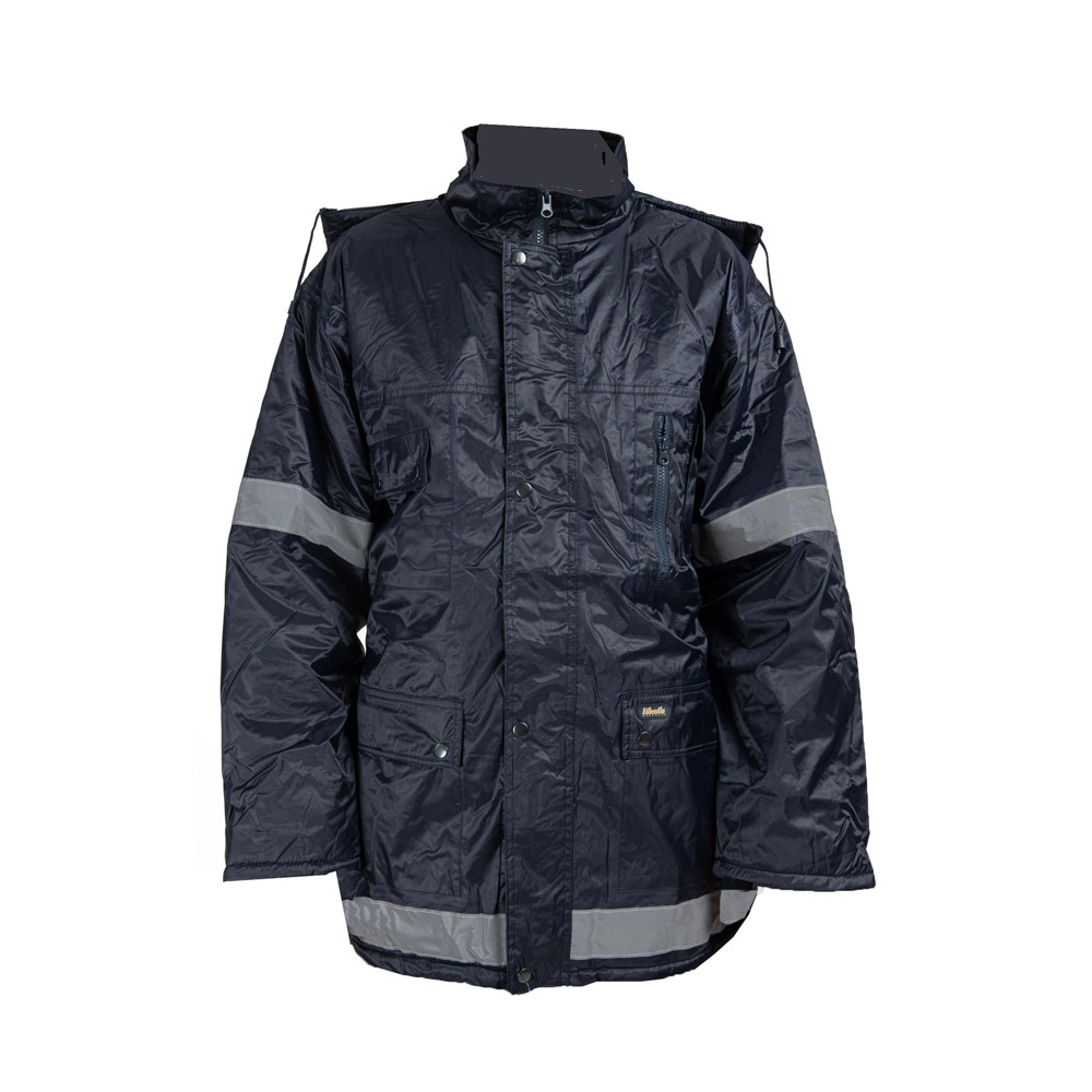 Τζάκετ τύπου παρκά, αδιάβροχο, με εσωτερική μόνωση για προστασία από το ψύχος και κουκούλα με φερμουάρ. Μπροστινό κλείσιμο με φερμουάρ με καπάκι και κουμπιά, δυο τσέπες στο στήθος, με καπάκι και μια με φερμουάρ και θήκη για κινητό και δυο μπροστινές τσέπες με καπάκι και κουμπιά. Διατίθεται και με ανακλαστικές ταινίες στα χέρια, την πλάτη και το κάτω μέρος. Σύνθεση από 100 % PVC στο εξωτερικό και 100 % πολυεστέρα στο εσωτερικό.
